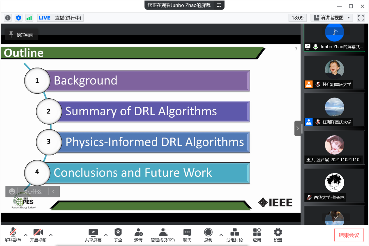 On the morning of April 24, 2022, Zhao Junbo, assistant professor with the School of Electrical and Computer Engineering, University of Connecticut, was invited to deliver a speech at the “Online Lecture Hall” on the topic of “Physics-Informed Deep Reinforcement Learning for Power System Optimization and Control”. The series of online academic lectures were jointly organized by the School o...