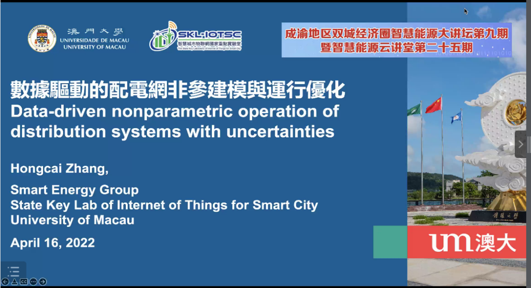 On the afternoon of April 16, 2022, Zhang Hongcai, Assistant Professor with State Key Laboratory of Smart City Internet of Things, University of Macau, was invited to deliver a speech at the “Online Lecture Hall” on the topic of “Data-driven Nonparametric Operation of Distribution Systems with Uncertainties”. The series of online academic lectures were jointly organized by the School of Ele...