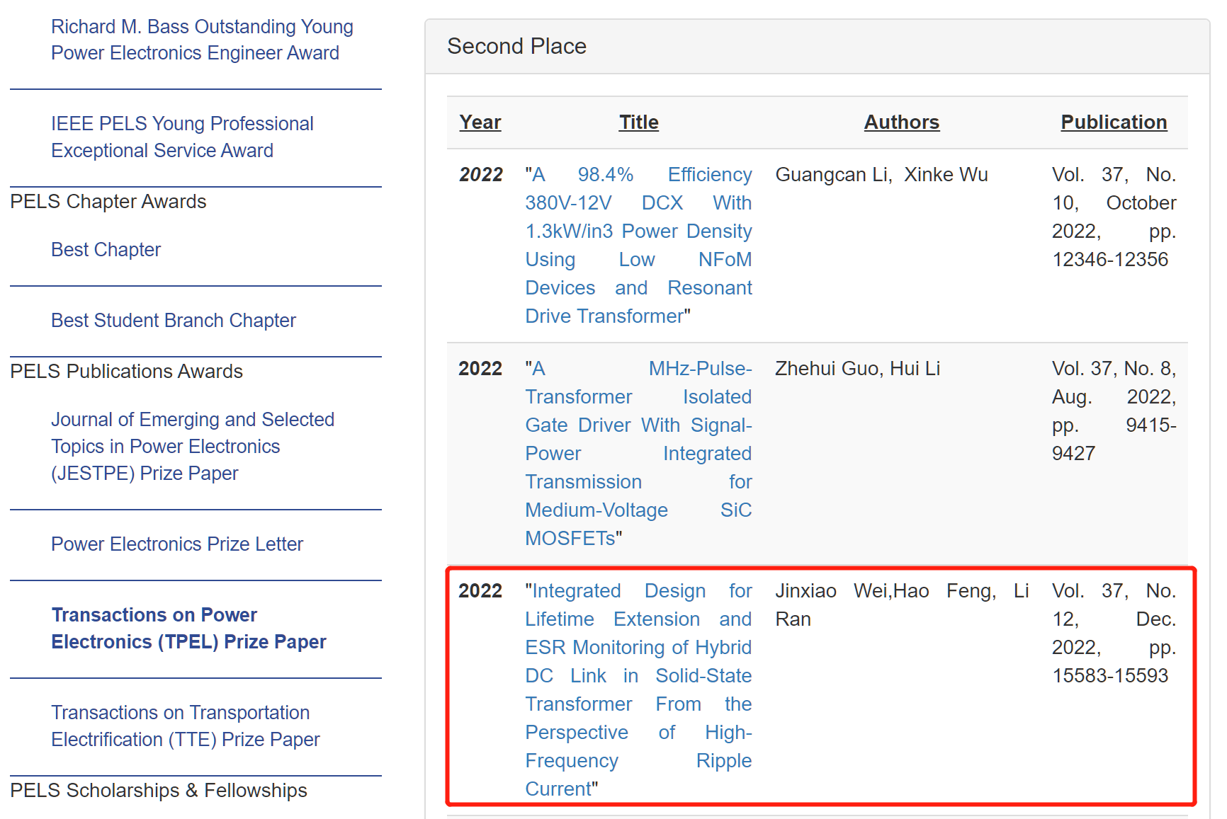 近日,IEEE电力电子学会(PELS)公布了旗舰期刊IEEE Transactions on Power Electronics (TPEL) 2022年度论文奖(Prize Paper Award)获奖名单。亚洲博彩平台排名-博彩平台排行榜 电力电子与电力传动系博士生魏金萧、丰昊副教授(通讯作者)和冉立教授合作的论文《Integrated Design for Lifetime Extension and ESR Monitoring of Hybrid DC Link in Solid-State Transformer From the Perspective of High-Frequency Ripple Current》获得...
