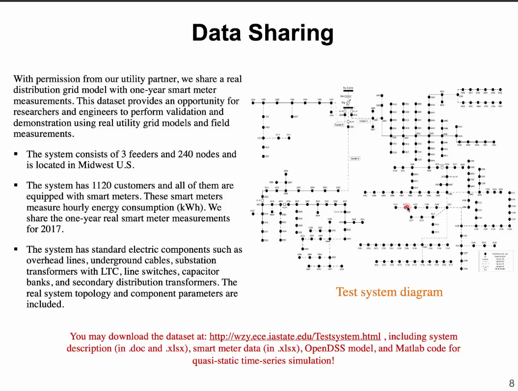 王教授从配电网引入,首先介绍了智能电表装在哪里、测量什么以及测量间隔是多少等相关问题。配网与用户侧连接,智能电表安装在用户家中,主要可以测量电量和电压,测量间隔根据不同地区要求一般为15min、30min和60min。虽然智能电表测量的物理量非常有限,测量的速度也不快,但由于其在用户侧的广泛应用,智能电表的数据是加强配电网监控和控制的良好资源。