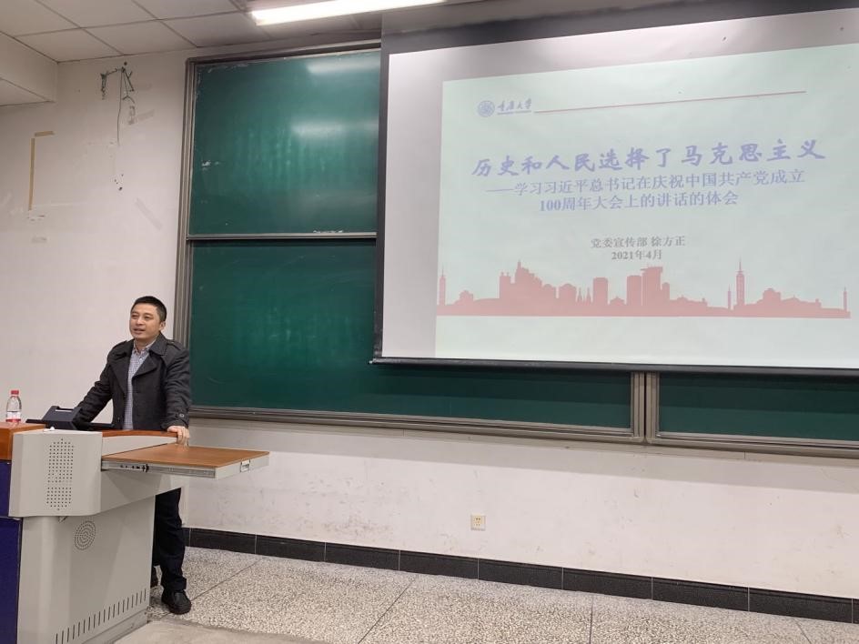 2021年11月11日,重庆大学党委宣传部徐方正以“为什么说历史和人民选择了马克思主义”为主题第三次集中课堂教学,徐老师从解读习近平总书记在庆祝建党一百周年大会上的讲话精神为引,从救亡图存方向的转变、早期的马克思主义者、为何选择马克思主义、事实证明选择的正确等四个方面,阐述了中国共产党为什么能,马克思主义为什么行,中国特色社会主义为什么好。