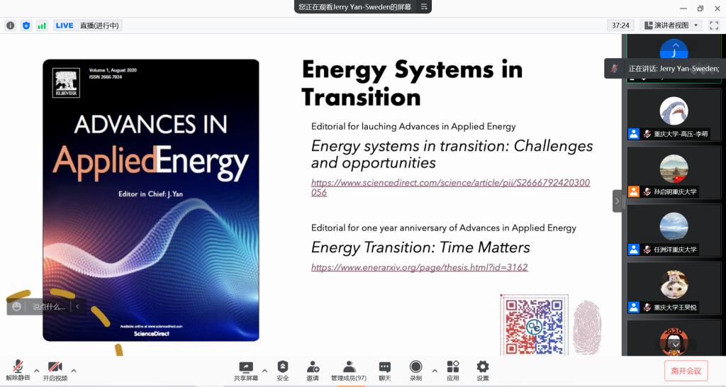 2021年11月6日下午,欧洲人文与科学院院士,Applied Energy主编严晋跃(Jerry Yan)教授受邀做客“成渝地区双城经济圈智慧能源大讲坛”,担任讲坛第二期的主讲嘉宾,以“Transitions of Future Energy Systems Towards Carbon Neutrality”为主题开讲。“成渝地区双城经济圈智慧能源大讲坛”是贯彻落实成渝双城经济圈国家发展战略,深化成渝两地教育资源合作共享的重要举措。讲坛由重庆大学、输配电装备及系统安全与新技术国家重点实验室和重庆大学溧阳智慧城市研究院主办,由成都地区的四川大学、电子科技大学、西南交通大学、成都理工大学、成都中医药大学、四川师范大学、西华大学、西南科技大学和重庆地区的西南大学、重庆邮电大学、重庆科技学院等高校协办。本期讲坛由亚洲博彩平台排名-博彩平台排行榜