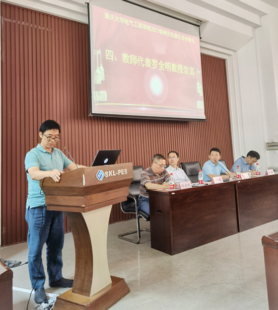 首先,李剑院长代表学院对2021级研究生新生的到来表示热烈欢迎,向全体研究生新生提出祝愿与希望:一是鼓励大家胸怀祖国,自觉肩负历史重任,主动追求科学理想;二是敢于直面挑战,锐意进取,开拓创新,立足电气学院的高平台,遵循导师教诲,勇于应对挑战;三是求真务实,在科研和学习中务必做到求真求实,以学求实,知行合一;四是追求精进的科学素养和高尚的人文精神,强健体魄。他祝福同学们在重庆大学实现自己美好的人生理想,成为重大电气一流学科永远的骄傲。