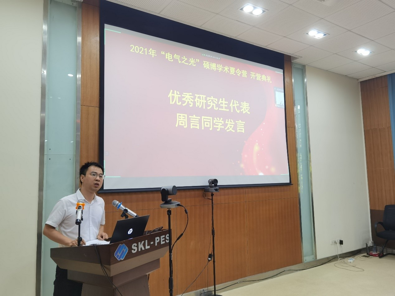 优秀研究生代表、全国青年马克思主义者培养工程优秀学员周言同学作为学生代表发言。他结合自己的成长经历,感谢学院在个人前行的道路上提拱了一个广阔的舞台和多样的选择,希望广大学弟学妹们把握好机会,加入电气学院,做有志气,有骨气,有底气的有志青年。