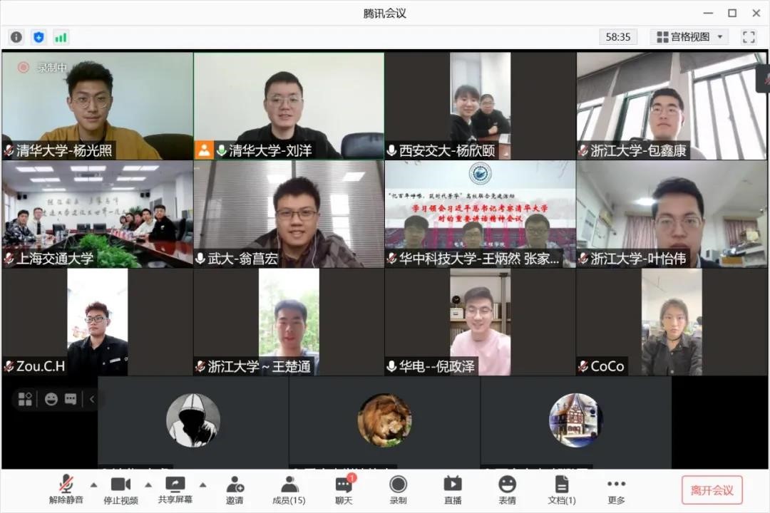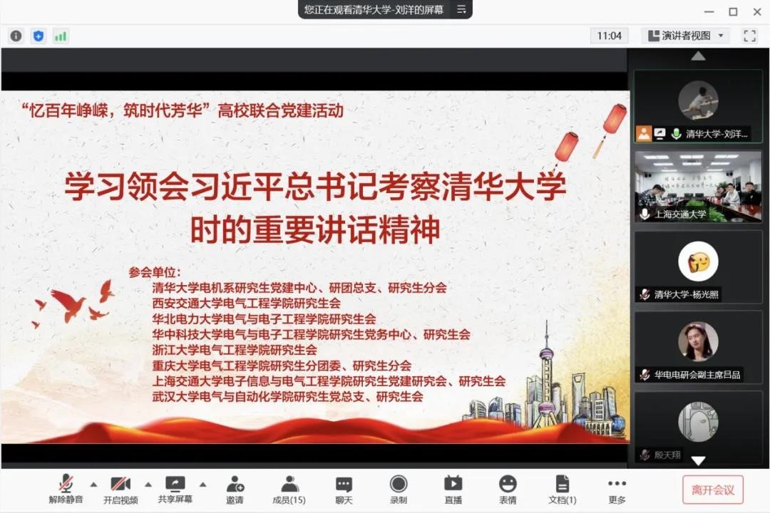 和武汉大学电气与自动化学院等八所高校院系研究生组织共同发起高校联合党建活动,各高校负责人齐聚线上,召开“忆百年峥嵘,筑时代芳华”专题座谈会,集体回看新闻联播,学习领会习近平总书记考察清华大学时的重要讲话精神,大家纷纷结合实际,深入交流了本次学习体会。