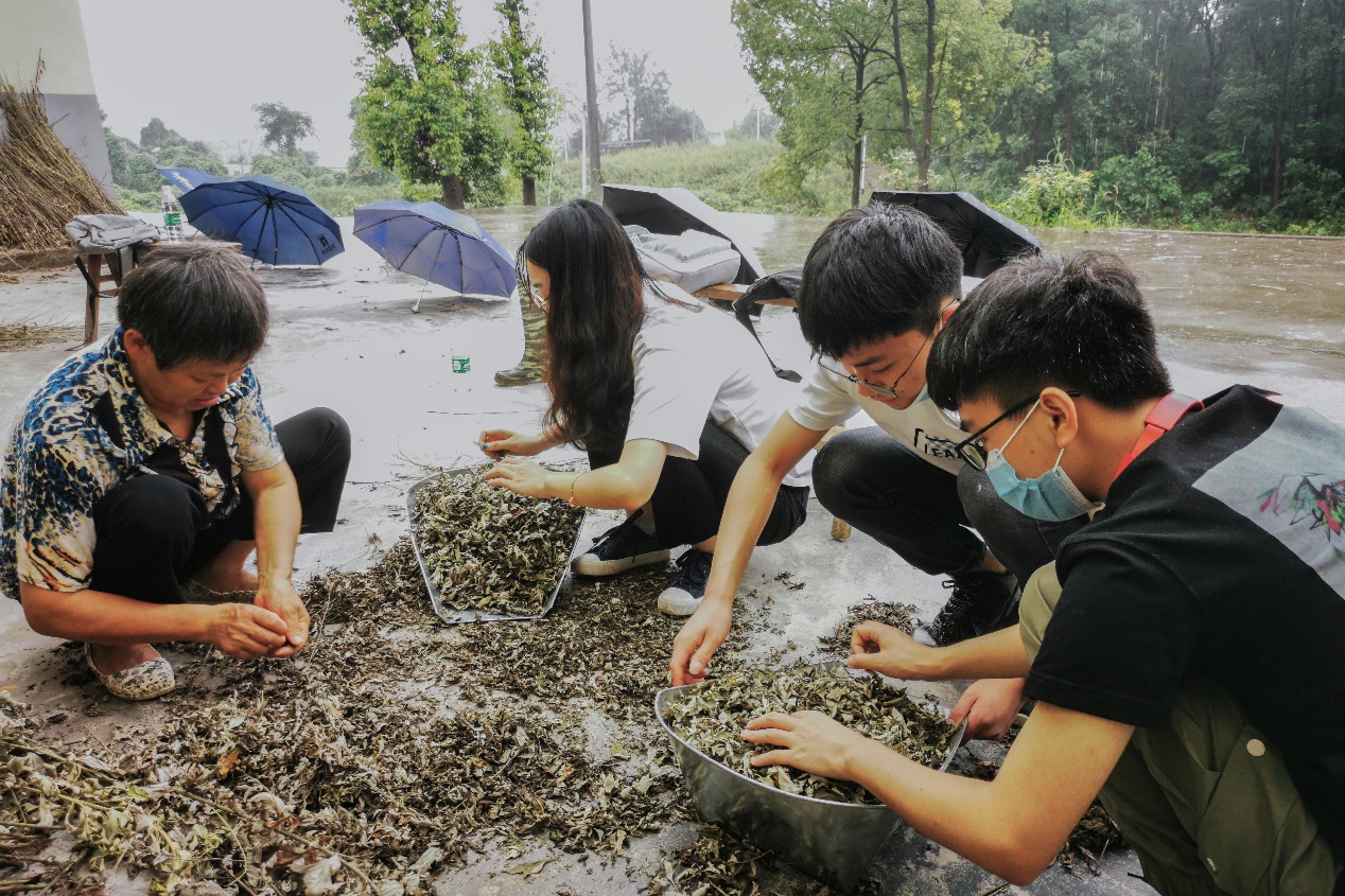 伴着蒙蒙细雨,实践团一行人前往青木湖村艾草基地。实践团成员抵达时,负责日常管理艾草基地的陈阿姨正在库房劳作。实践团成员们提出和陈阿姨一起共同劳作,将晒干的艾草叶从桔梗上剥离下来。