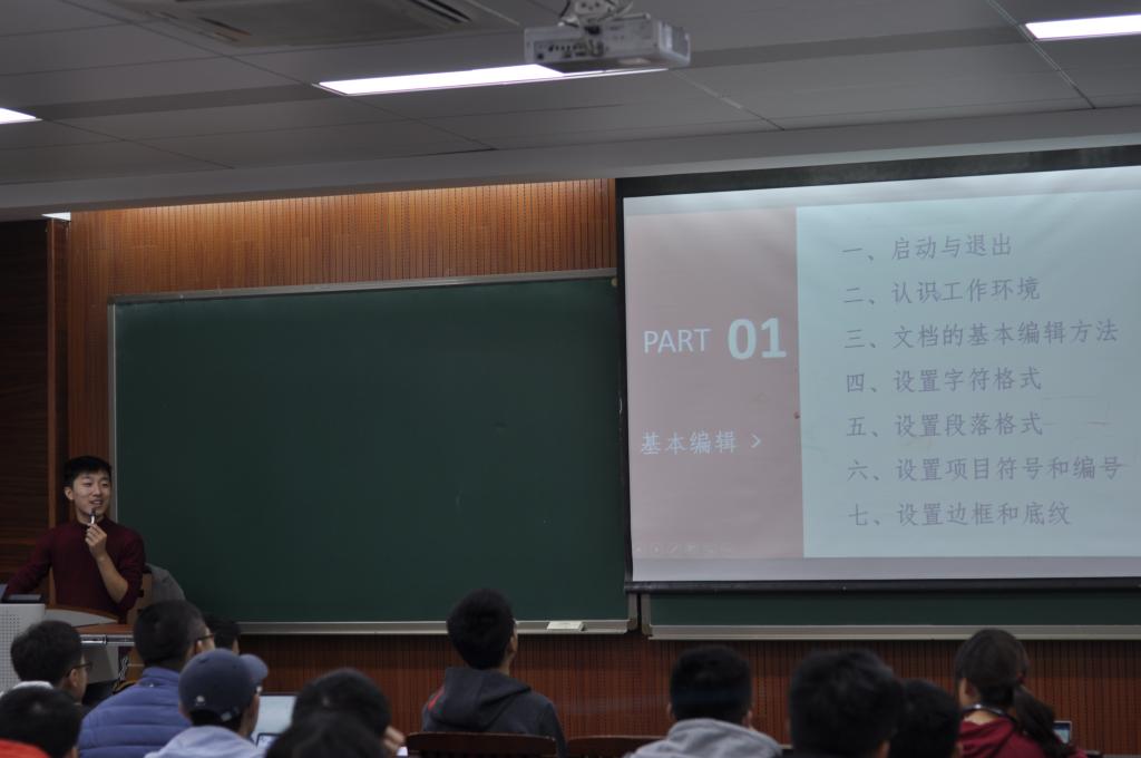 在彭贤波同学简短的自我介绍后,培训会正式开始。首先彭贤波同学介绍了office的安装方法和使用方法。紧接着,彭贤波同学从基本编辑和文档排版两个方面给大家详细地讲解了word的使用技巧。