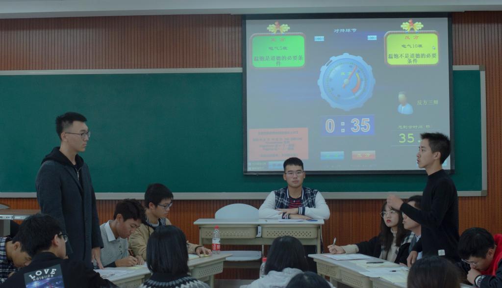 在之后的二辩申论环节,反方二辩俞子翔首先就正方的“个人道德与社会道德”这一观点予以否定,但回击的效果并不明显,反而给正方留下了破绽之处,正方二辩张志豪借此再次强调了“道德的普遍性”。双方争锋相对,现场气氛迅速升温。紧接着的双方三辩对辩环节,反方三辩步步紧逼,而正方三辩巧妙回应,颇有针尖对麦芒之势。随后的三辩申论环节,正反方一吐为快,有理有据,令场下观众为之折服,也将比赛推向了高潮部分:自由辩论环节。