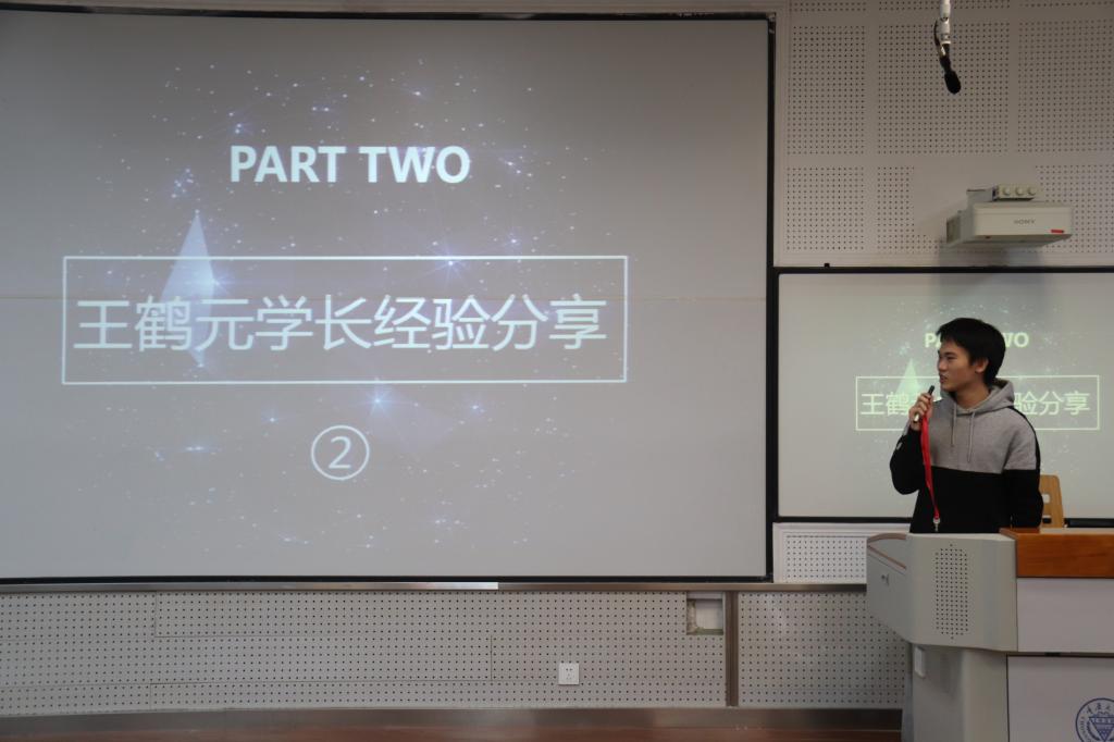 随后由美国大学生数学建模竞赛f奖得主王鹤元学长作经验分享。他曾在两次电赛中都获得优异成绩,他给同学们提出了许多现实可行的建议和诚恳的忠告。他告诉大家:“竞赛的题目多样,需要大家有全方面的知识储备,唯有提出合理的假设并坚持做下去,才能达到创新创造的目的。”