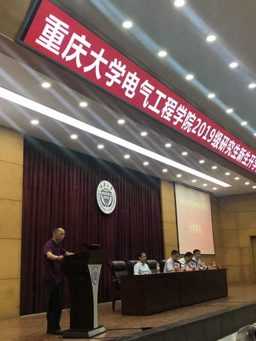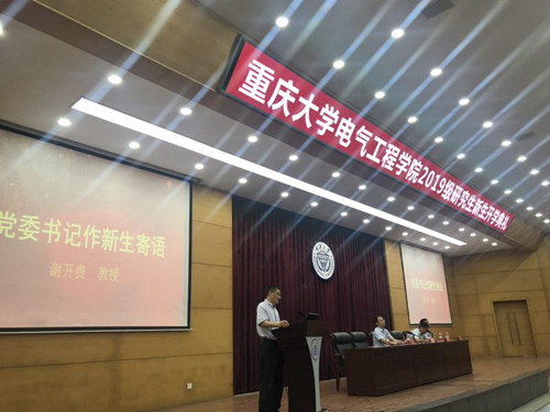 随后,谢开贵书记为研究生做新生寄语。谢书记希望全体研究生新生能够珍惜在重庆大学求学的机会,为祖国的现代化建设事业做出了卓越贡献,把学院延伸到了广阔的社会空间和时代的前沿。谢书记回顾学院发展八十多年的峥嵘岁月,期待同学们以电气工程学科发展前沿和国家需求为导向,扎实基本功,发挥电气先锋精神,努力成为各行各业的领军人物,续写辉煌。