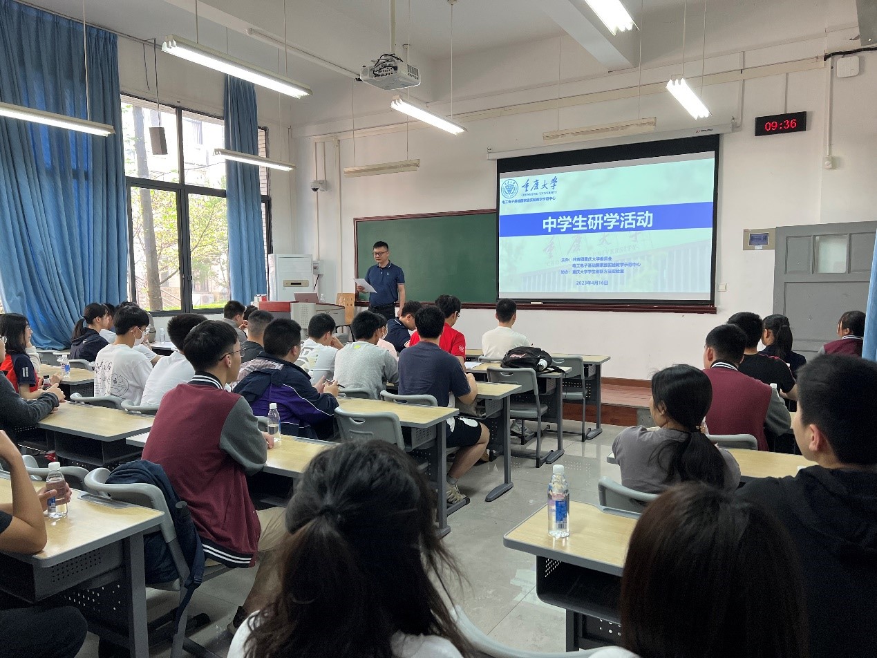 2023年4月16日,在共青团重庆大学委员会的支持下,重庆大学电工电子国家级实验教学示范中心举行了举行了2023年第一期中学生研学活动。此次活动在虎溪校区举行,吸引了来自重庆市直属重点中学的40余名优秀高中学生参与,带领中学生走进大学、走进国家级实验教学示范中心,与专家学者对话交流,激发学生科技兴趣、启迪科学思维、培养科创能力。同时正值本科招生宣传季,此次活动使得学生对重庆大学有了更深入的了解,尤其是对电气工程学科有了更具象的认识,是一次兼具科普与宣传意义的活动。